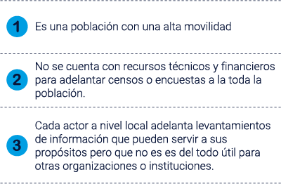 Uno de los aspectos más importantes en el momento de definir acciones de política a nivel local es el de contar con información sobre la población objeto de dichas acciones. Para el caso de la población migrante esa información en muchos casos es escasa o insuficiente entre otros factores debido a: